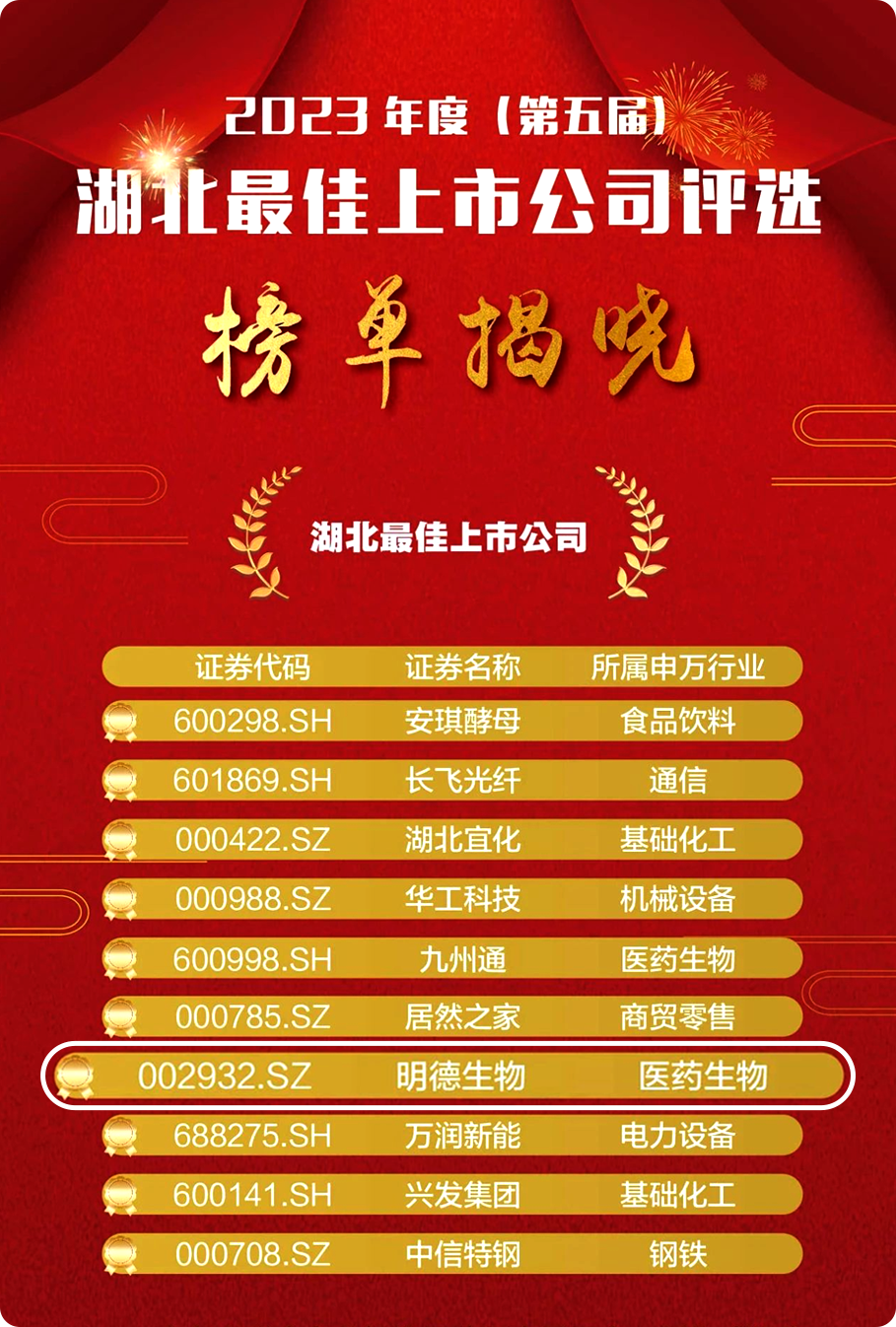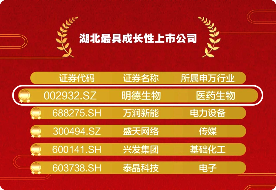 入圍公司在經(jīng)營業(yè)績、規(guī)范治理、市場認(rèn)可度、投資回報(bào)、社會責(zé)任等方面均表現(xiàn)突出,是引領(lǐng)湖北上市公司高質(zhì)量發(fā)展的領(lǐng)軍企業(yè)。明德生物連續(xù)多年蟬聯(lián)榜單,體現(xiàn)了湖北資本板塊對企業(yè)高質(zhì)量發(fā)展的認(rèn)可。