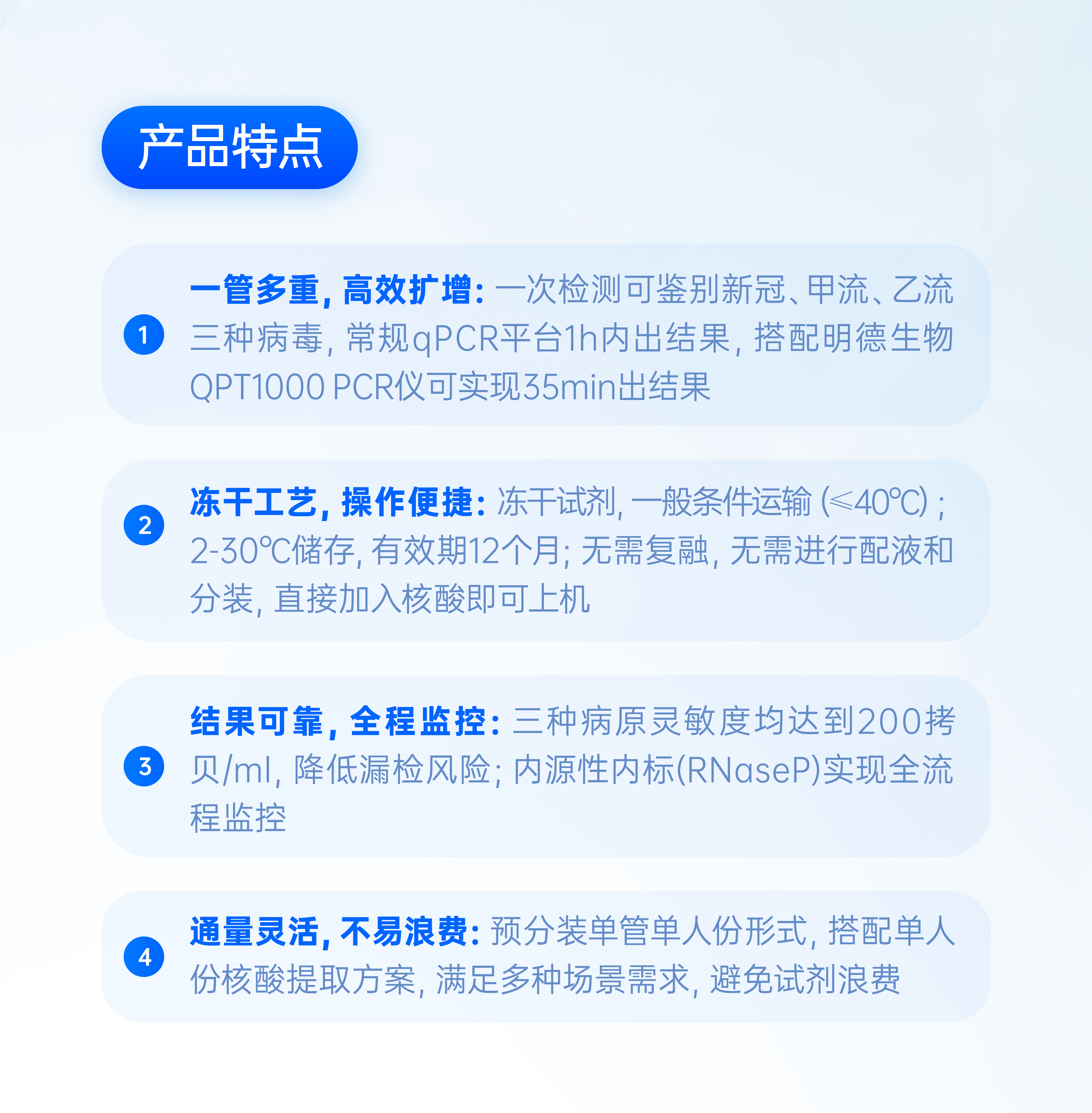 明德生物自主研發(fā)生產(chǎn)的新型冠狀病毒2019-nCoV、甲型流感病毒及乙型流感病毒核酸檢測(cè)試劑盒(熒光PCR法),可提升臨床對(duì)于新冠及流感病毒的診斷能力,能夠滿(mǎn)足醫(yī)療機(jī)構(gòu)急診科、兒科、發(fā)熱門(mén)診、檢驗(yàn)科等不同應(yīng)用場(chǎng)景下相關(guān)呼吸道感染輔助診斷的需求,有效提高病毒檢出率的同時(shí),降低復(fù)診和等待周期,在多種呼吸道病原體流行高發(fā)時(shí)節(jié)加快臨床/門(mén)診診療效率。