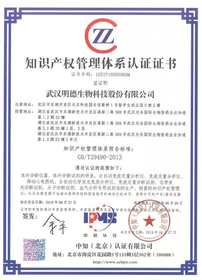 近日,明德生物順利通過(guò)《企業(yè)知識(shí)產(chǎn)權(quán)管理規(guī)范》(國(guó)家標(biāo)準(zhǔn)GB/T 29490-2013)認(rèn)證評(píng)審,榮獲《知識(shí)產(chǎn)權(quán)管理體系認(rèn)證證書》,這標(biāo)志著公司知識(shí)產(chǎn)權(quán)管理體系建設(shè)邁上了標(biāo)準(zhǔn)化、規(guī)范化、制度化的軌道,在知識(shí)產(chǎn)權(quán)創(chuàng)造、運(yùn)用、管理和保護(hù)方面達(dá)到行業(yè)領(lǐng)先水平。明德生物本次通過(guò)認(rèn)證的范圍有:體外診斷儀器、體外診斷試劑的研發(fā),全自動(dòng)免疫定量分析儀、免疫定量分析儀、化學(xué)發(fā)光診斷試劑、分子診斷試劑、血?dú)夥治鰧S迷噭┌纳a(chǎn)、銷售的知識(shí)產(chǎn)權(quán)管理。