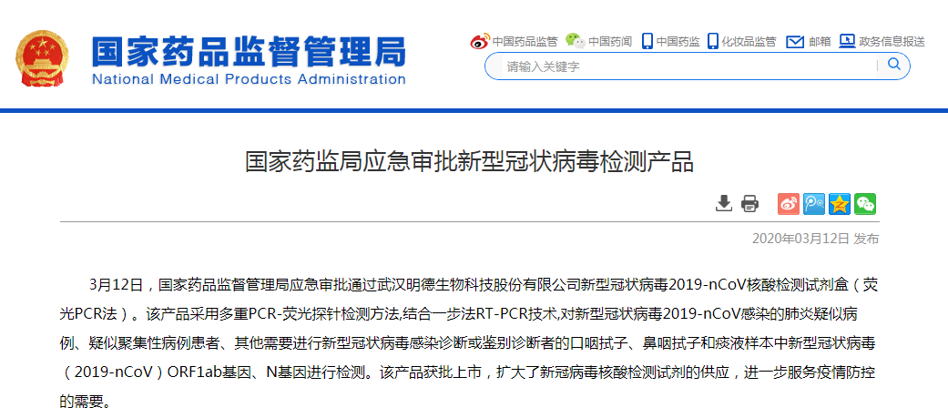 3月12日,國家藥品監(jiān)督管理局應(yīng)急審批通過武漢明德生物科技股份有限公司新型冠狀病毒2019-nCoV核酸檢測試劑盒(熒光PCR法)。
