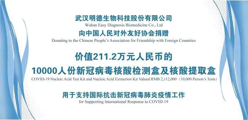 明德生物積極支持國內(nèi)外抗“疫”事業(yè),自1月起明德生物義不容辭向各醫(yī)療機(jī)構(gòu)多次累計(jì)捐贈核酸試劑、診斷儀器市值超過1000萬元人民幣。明德生物作為一家專業(yè)的IVD企業(yè)在國際疫情嚴(yán)峻時刻挺身而出,發(fā)揮全球化優(yōu)勢,參與國際抗“疫”援助,助力世界各地共同抗疫,共克時艱。相信中摩兩國人民緊密團(tuán)結(jié),一定可以盡快戰(zhàn)勝疫情。