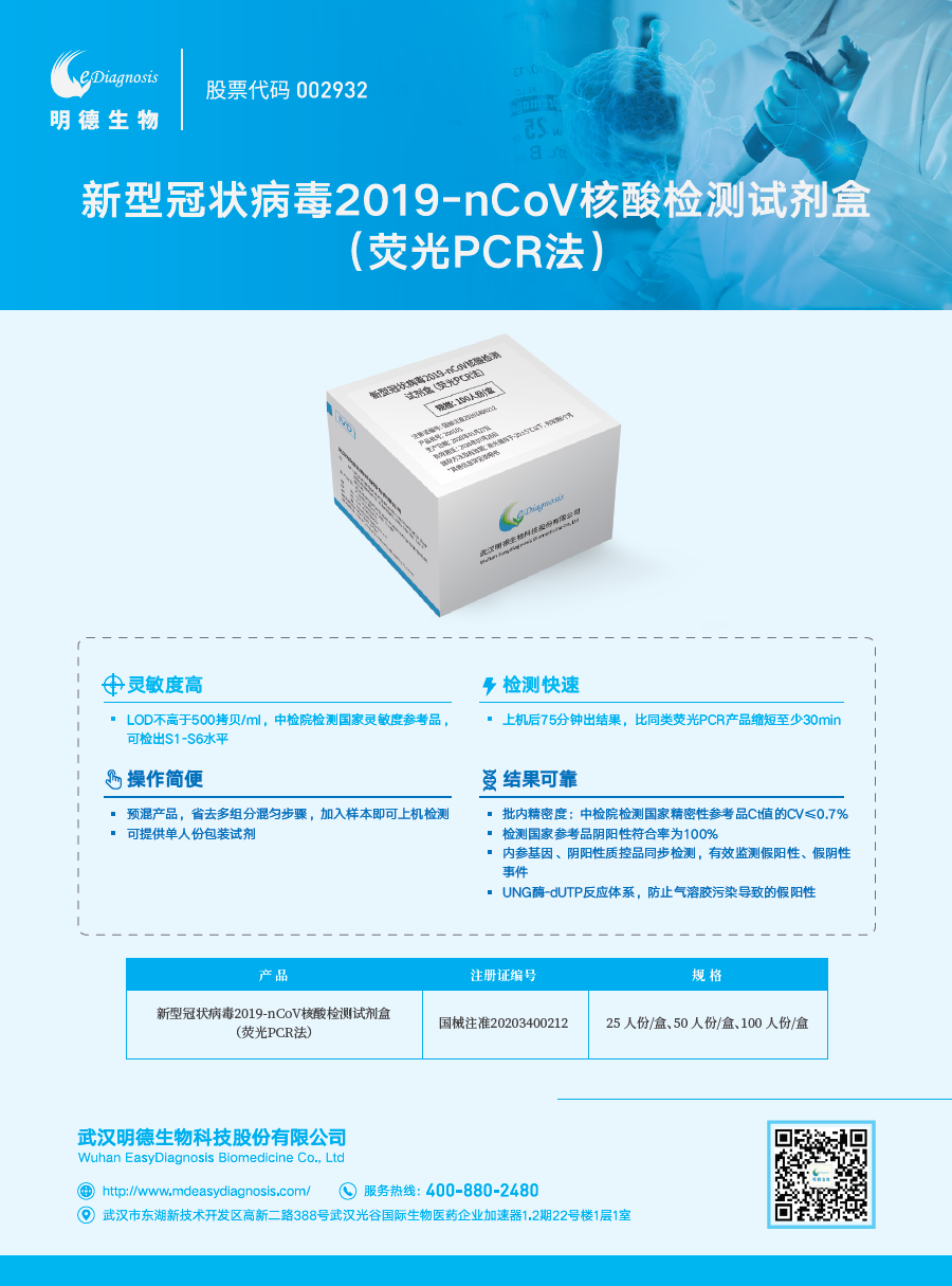 武漢明德生物科技股份有限公司(002932.SZ)成立于2008年,坐落于國家生物產(chǎn)業(yè)基地——武漢光谷生物城。是一家專業(yè)提供體外診斷試劑及配套儀器(POCT\分子診斷\化學(xué)發(fā)光\血?dú)夥治龅?產(chǎn)品以及胸痛中心、卒中中心、心電網(wǎng)絡(luò)等醫(yī)療服務(wù)的國家高新技術(shù)企業(yè),湖北省企業(yè)技術(shù)中心,武漢市企業(yè)研究開發(fā)中心。國內(nèi)高通量POCT倡導(dǎo)者,胸痛中心、卒中中心及遠(yuǎn)程心電網(wǎng)絡(luò)建設(shè)者。目前主營業(yè)務(wù)已覆蓋全國30個省、直轄市、自治區(qū)近4000家醫(yī)療機(jī)構(gòu),同時在亞洲、歐盟、南美等多個區(qū)域?qū)崿F(xiàn)銷售布局。公司于2018年7月10日在深交所掛牌上市,股票代碼002932。