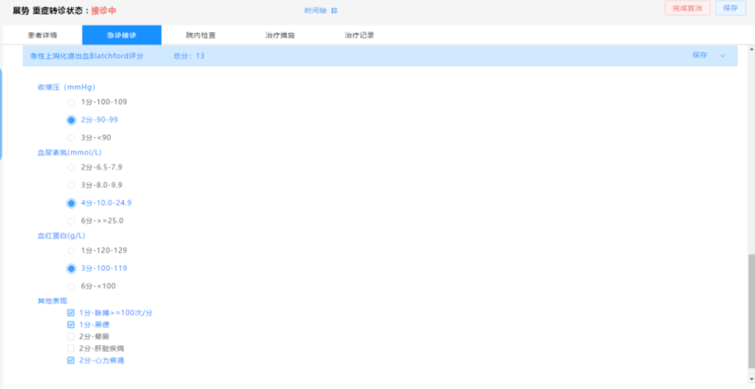 根據(jù)2020版上消化道出血的專家共識(shí),高危急性上消化道出血患者應(yīng)進(jìn)行緊急處置,如容量復(fù)蘇、輸血、血管活性藥物應(yīng)用及初始藥物治療等。明德上消化道出血急危重癥救治系統(tǒng)通過點(diǎn)選的方式進(jìn)行快捷的記錄,簡(jiǎn)化操作流程的同時(shí),保證治療措施完整記錄。