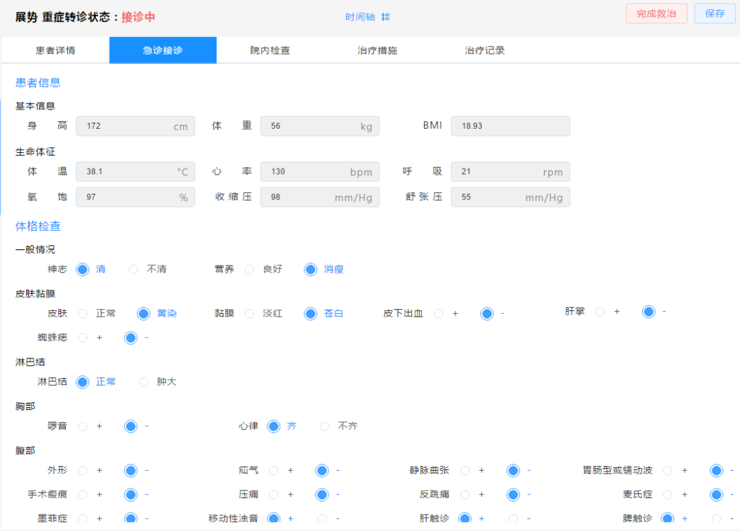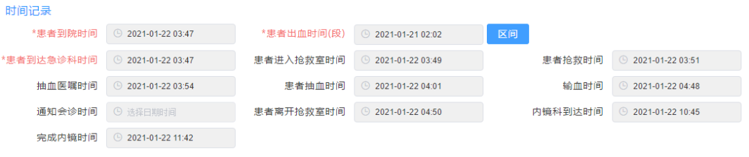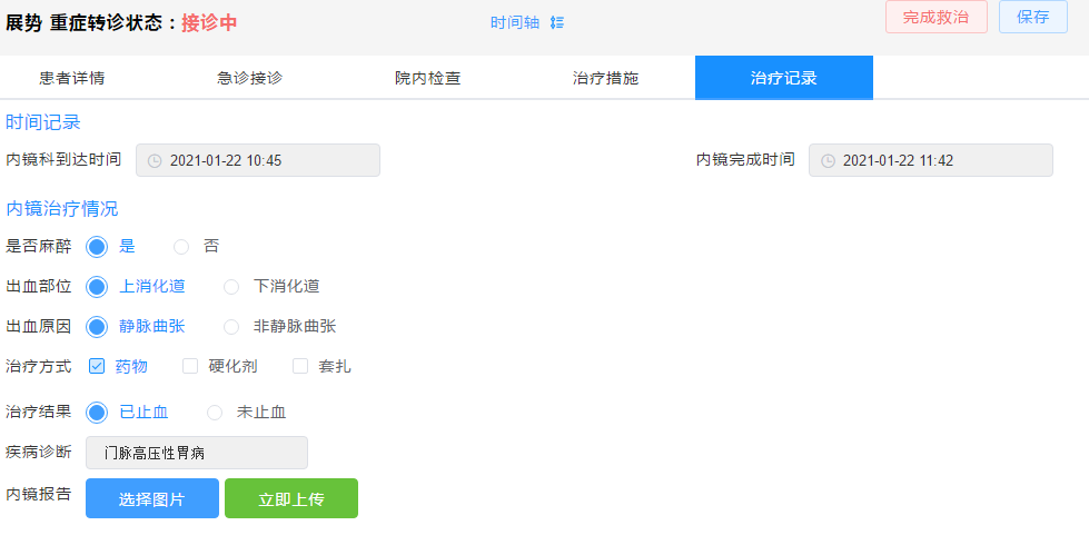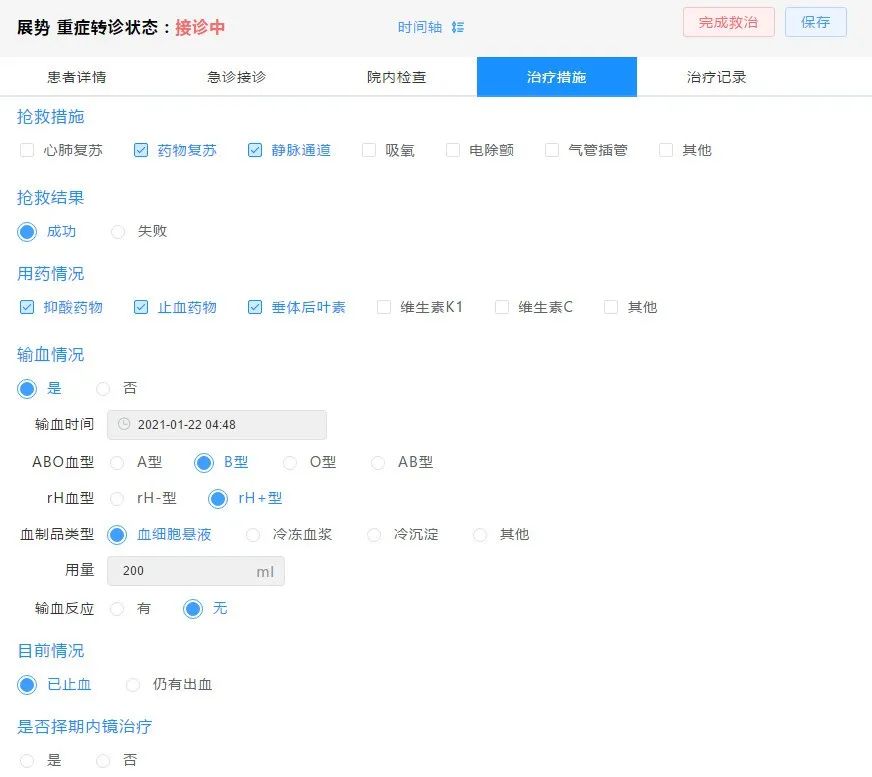 初步病情判斷過后,診斷及快速救治則成了核心問題。由于上消化道出血這一病種的特殊性,成就了其“邊治療、邊診斷”的救治特點(diǎn),如何搶救,輸血,用藥及急診內(nèi)鏡的使用決策,與患者的病情變化息息相關(guān)。明德上消化道出血急危重癥救治系統(tǒng)即采用“邊診治、邊記錄”的方法,完整記錄患者的全救治流程及關(guān)鍵時(shí)間點(diǎn)并形成時(shí)間軸,以此滿足其就診特點(diǎn),從用藥和其他治療手段及時(shí)展開救治并反復(fù)驗(yàn)證其根本病因。