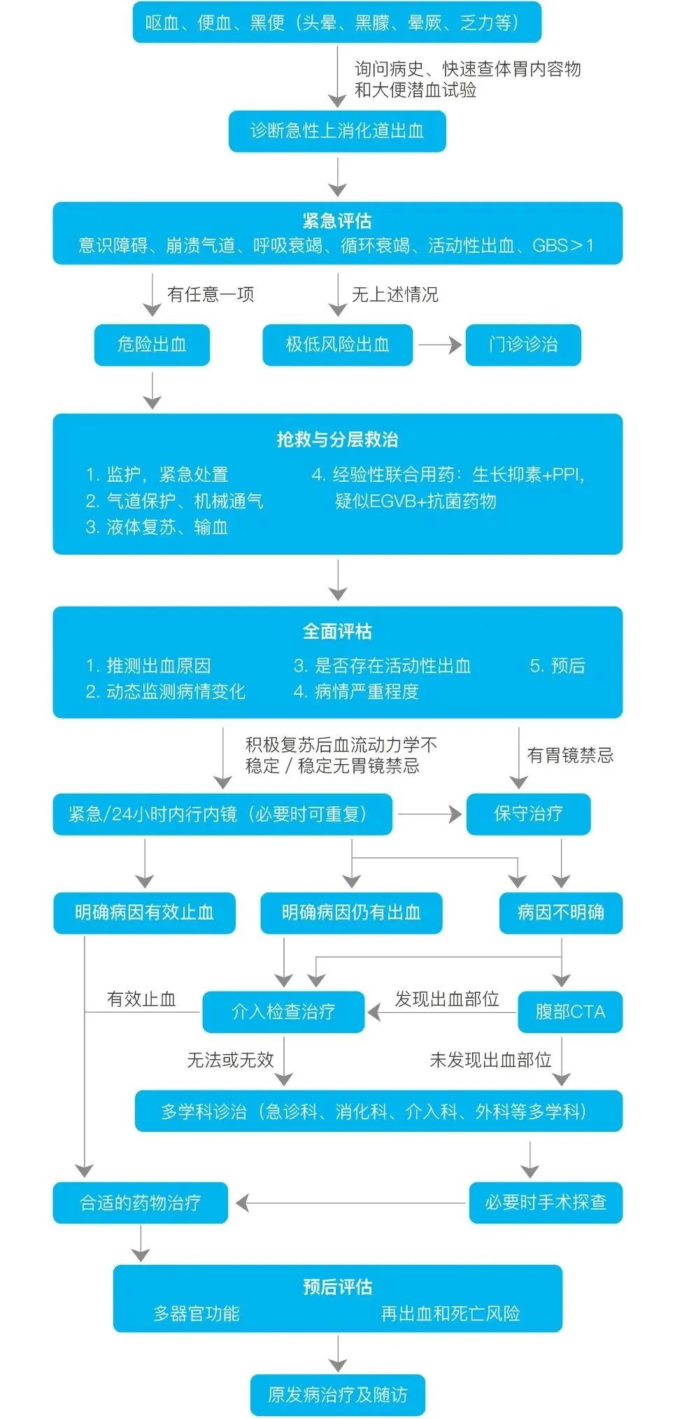 此次共識(shí)仍秉承急診“降階梯思維”的理念,按照“3次評(píng)估、2次治療”的方法對(duì)急性上消化道出血急診診治流程進(jìn)行構(gòu)建,力求臨床的可操作性和實(shí)用性。