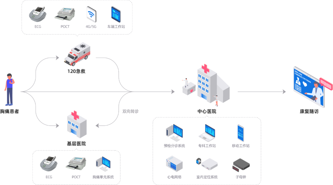 明德生物急危重癥平臺為醫(yī)院提供胸痛,卒中中心建設(shè)一站式服務(wù),實現(xiàn)急診院前、院中、院后多業(yè)務(wù)全流程的閉環(huán)可追溯管理。