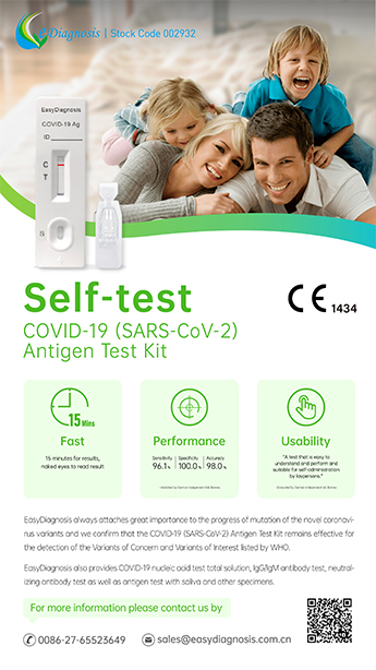 明德生物新冠病毒抗原自測試劑盒,具有快速、便捷、使用場景廣泛等特點,15分鐘快速獲取結(jié)果。經(jīng)德國獨立實驗室Biomex評估,產(chǎn)品靈敏度96.1%,特異性100%,準(zhǔn)確性98%;針對CT值小于30的樣本,靈敏度達(dá)98.8%,方便個人及家庭對新冠病毒的自主檢測。此外,目前已被WHO列為Concern和Interest的8種變異毒株,不影響檢測結(jié)果。