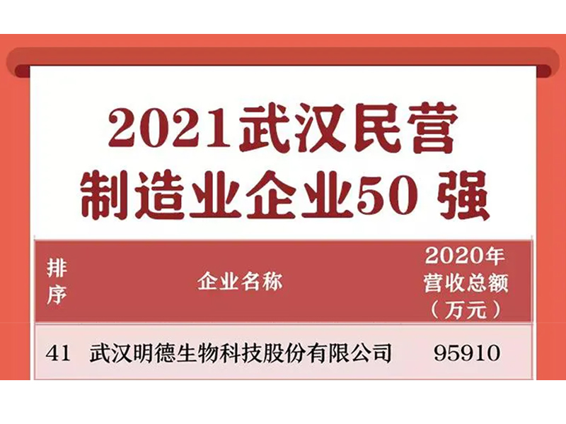 近期,武漢市工商聯(lián)發(fā)布“2021武漢民營企業(yè)100強”和“2021武漢民營制造業(yè)企業(yè)50強”榜單。明德生物榜上有名,躋身“武漢民營制造業(yè)企業(yè)50強”。