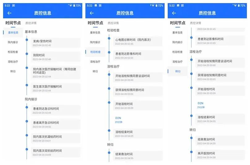 救治過(guò)程中,各項(xiàng)關(guān)鍵時(shí)間節(jié)點(diǎn)通過(guò)胸痛中心信息化系統(tǒng),結(jié)合物聯(lián)網(wǎng)的方式自動(dòng)記錄采集,幫助醫(yī)護(hù)在緊張的救治過(guò)程中快速記錄時(shí)間節(jié)點(diǎn),使得醫(yī)護(hù)精力可以專注在危重患者救治上,在救治的同時(shí),實(shí)時(shí)掌握質(zhì)控指標(biāo)達(dá)成情況。